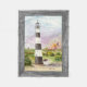 The distinctive black-and-white banded Cape Canaveral lighthouse in Florida is depicted in this watercolor painting by JC Prida. In the background, a rocket takes off from nearby Kennedy Space Centre. The lighthouse is surrounded by greenery, with a small outbuilding next to it. The sky is blue with tinges of purple behind the lighthouse, and the smoke and fire from the rocket launch in the background at right. This Cape Canaveral Lighthouse replaced the original 65-foot brick lighthouse, and was lit for the first time in 1868. It was originally white; the black bands were added in 1873.