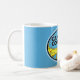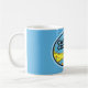 A vintage travel sticker of Cape Cod Massachusetts repurposed on a coffee mug. This one has a blue background. We have another available on a white mug.