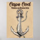 Cape cod Massachusetts Vintage travel poster. Ships fishing boat anchor retro poster.