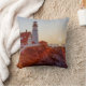 This photo features the rising sun behind the lighthouse along the rocky shoreline. A white fence helps to separate the lighthouse from the sea.