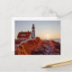 This photo features the rising sun behind the lighthouse along the rocky shoreline. A white fence helps to separate the lighthouse from the sea.