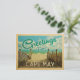 This Greetings From Cape May vintage postcard design features a sandy beach with a beautiful turquoise ocean water and above the sea, a blue sky with billowy white clouds. In vintage travels style.