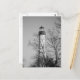 This is a black and white photo of the Cape May Lighthouse. Known to locals as Cape May Light, it is located in southern New Jersey in Cape May Point State Park. The lighthouse is at the very tip of South Jersey and serves as a beacon to incoming ships. This scenic photo was taken in winter, and the lighthouse can be seen through the bare branches of trees in the foreground. The lighthouse is a NJ landmark, a Cape May tourist attraction, and a beautiful piece of architecture.