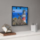 A vibrant and vivid photograph from the remote and magical Cape Palliser, New Zealand. This photo feature the top of a classic lighthouse wiith a red stripe and a rounded dome shaped roof. The perspective and angle of this photo is quite dramatic, showing the waves crashing down below giving the viewer a sense of the lighthouses height. The deep blue sea can be seen reaching out into the distance under a bright blue sky. The rugged coastal rocks of the area can be seen in the foreground. The gorgeous contrasting colours in this nature scene really make this image come alive.