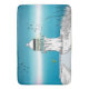 An illustration of the lighthouse at Cape Reinga in New Zealand, the lighthouse is drawn and black and white and is lighting up a blue sky period. Native New Zealand flax is stand a long the track to the lighthouse.
