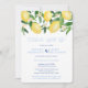 Fresh citrus "celebrate with us" post-wedding party invitations featuring vibrant watercolor lemons and glossy green leaves with pretty blossoms, complemented by cobalt blue and white tile reverse side.