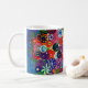 Capricious Happy Colourful Tree Original Artwork Coffee Mug. Quirky vivid romantic flowers bloom in a tree garden. The story-like, beautiful scene captures the energising effect through vibrant colours, with a black and white tree trunk. One can smell the scent of the varied flourishing flowers through whimsical blossoming details. This original artwork is hand-painted in acrylic, with markers on top, by artist Aleksandra Grbic Hrustic. Copyright, all rights reserved. This colourful mug is the ideal partner for the morning coffee.