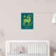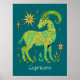 Poster in a stylised depiction of a goat, intricately decorated with patterns of green and yellow, representing the zodiac sign Capricorn. Surrounding elements include celestial symbols and leafy designs.