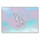 A mother of pearl style Capricorn zodiac symbol on a soft mix of pastel pink and blue print background. A modern urban racy design for a great custom birthday gift idea for her.