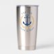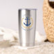 Personalised nautical themed, stainless steel, insulated tumblers with "Captain" (or other rank or title) and your boat name, family name or other desired text. This design features a custom made boat anchor in navy blue accented with a gold coloured star and regal gold laurel leaves.