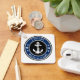 A nautical themed, two sided, square metal keychain. On the front side is your personalised name, boat name or other text and the Captain rank or other title as desired. The front side also features a custom designed boat anchor with rope and stars in classic navy blue, black and white. The back side features your personal photo. This keyring makes a great unique gift for any occasion.