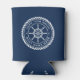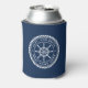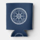 Can cooler featuring a white, elegant ship's wheel and rope emblem with your custom captain's name and boat name on a dark blue background.