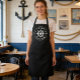 A stylish nautical themed apron with your personalised name, boat name or other desired text. Features a custom ships wheel helm design with stars in white on black. Easily customise the apron colour to match your current decor. Cook, bake and BBQ in Style. Makes a great gift and conversation piece for any occasion.