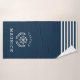 navy blue colour with white stripes and personalised name detail and nautical elements The colour and text are editable.