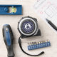 Captain old scruff logo personalised nautical tape measure. Navy blue with white circle emblem. Classic block text.