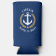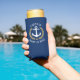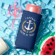A Personalised Tall Can Cooler with Captain or other title and your boat name, family name or other desired text. Featuring a custom designed nautical boat anchor, gold style laurel leaves and star emblem on navy blue or easily change the base colour as desired. Makes a great gift for any occasion.