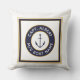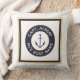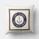 Personalised captain with your name and boat name nautical anchor logo square pillow. Classic circle emblem with anchor and text fields within an outer square border in navy blue, white and gold on a white background.