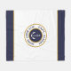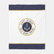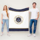 Personalised captain with your name and boat name nautical anchor logo fleece blanket. Classic circle emblem with anchor and text fields in navy blue, white and gold on a white background.