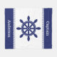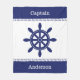 Personalise this nautical Captain's blanket with your name.  Design features a drawing of a navy blue captain's wheel and navy blue and white rope border.  The word "Captain" is above and below is a name for you to personalise.