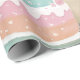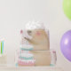 This whimsical illustration features a cheerful capybara celebrating a birthday in style. The capybara, adorned with a playful party hat topped with candles, joyfully holds a slice of cake. The scene is completed with a beautifully decorated two-tiered birthday cake, featuring pastel hues of pink, blue, and white, topped with vibrant candles. The festive backdrop includes pink and blue butterflies, floral patterns, and a string of colourful pennant banners, adding to the joyous ambiance. Perfect for birthday celebrations, party invitations, or themed merchandise, this charming design exudes fun and festivity.