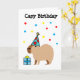 Funny capy birthday card for capybara lovers. Featuring a capybara wearing a red and blue party hat along with a gift with colourful polka dot confetti in red, yellow and blue.