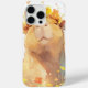 A capybara with a crown of flowers looks peaceful amidst vibrant blooms and fluttering butterflies. Soft, natural colours create a warm, serene atmosphere.