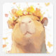 A majestic capybara gazes forward with a serene expression, adorned with a delicate floral crown of golden-yellow blossoms. Surrounding the capybara are vibrant wildflowers, and small butterflies flutter around, adding to the dreamy, nature-inspired atmosphere. The warm sunlight enhances the soft tones of the capybara’s fur, creating a peaceful and uplifting scene perfect for animal lovers and nature enthusiasts.
