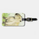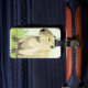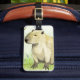 A watercolor painting of a Capybara sitting amongst blue flowers in the spring adorns this customisable luggage tag!