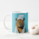 A charming and whimsical portrait of a capybara, the world’s largest rodent, dressed in a spa-like attire. The animal is draped in a white towel with another wrapped around its head, set against a soothing blue background. The capybara’s calm and serene expression gives the impression that it’s enjoying a moment of relaxation, adding a touch of humour and warmth to the scene. The detailed brushwork highlights the capybara’s fur and the soft texture of the towels, making this artwork a delightful and lighthearted piece.