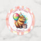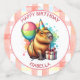 Adorable personalised capybara themed birthday party confetti with photos, age and name. A sweet watercolor capybara holding a balloon and birthday gift in pink and blue.