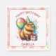Adorable personalised capybara themed birthday party napkins. A sweet watercolor capybara holding a balloon and birthday gift in pink and blue.