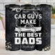 This graphic features a bold statement: "CAR GUYS MAKE THE BEST DADS," presented in white text against a dark, industrial diamond plate background. A classic car silhouette and two wrenches frame the central message, emphasizing the automotive theme. The design is accented by subtle splatter effects, adding to its rugged and impactful aesthetic, perfect for proud car enthusiasts and fathers.