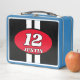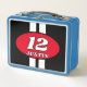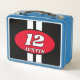 Car racing number design custom kid's Metal Lunch Box. Racing stripes design with oval number logo. Personalised text template and background colours. Add your own make year or racing number. Big bold letter typography with sporty striped lines. Automotive gift for children.