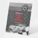 Red, grey, black and white race car car racing Bar Mitzvah welcome pedestal sign. This design features a grey (grey) race car with a black and white chequered flag and metal textures with red trim and racing fonts. It also features a Jewish Star of David symbol with a metallic look. Perfect for a go-kart racing Bar Mitzvah theme or a car racing Bar Mitzvah theme. It's a great choice for a boy who loves race cars and racing.