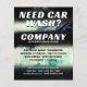 Car wash cover with dynamic image of water wave splash and luxury car. Includes price list, promo discounts and QR code space.