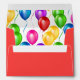 Card envelope is shown with a festive birthday balloons print on the inside and outside.
