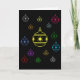 Fourteen round globe ornaments with central bands showing star bursts, are in various sizes, covering this card with a black background. On inside, you may personalise the text that reads "Happy Holidays - Wishing you happiness for the New Year!" In upper right corner are three more ornamental globes in blue, green, and red.