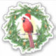 A holiday wreath with a Cardinal wearing a Santa hat.