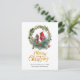 Cardinal Wreath Christmas Postcard – A Symbol of Joy and Remembrance: Send warm holiday wishes with this postcard featuring a beautifully illustrated wreath adorned with lush greenery, festive red berries, and a striking cardinal bird at its centre. Text: "Merry Christmas"