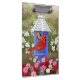A beautifully painted scene of red cardinals making their home in a bright blue birdhouse surrounded by a garden blooming with dogwood and colourful pink, red, and white cosmos flowers. Realistic artwork created from a painting by wildlife artist Crista S. Forest.