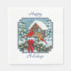 A pair of Northern Red Cardinals perch on a snow-covered white picket fence adorned with Christmas garland and a bright red bow. They feast at a winter bird feeder decorated with Christmas bells, ribbon, and holly. Realistic Artwork created by wildlife artist Crista S. Forest.