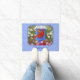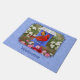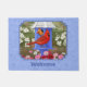 A beautifully painted scene of red cardinals making their home in a bright blue birdhouse surrounded by a garden blooming with dogwood and colourful pink, red, and white cosmos flowers. All on a matching blue patterned background.