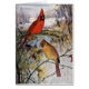 A pair of northern cardinals (Cardinalis cardinalis) perch on a rose bush in this wintry scene. A vintage illustration from 1915.
