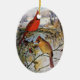 A pair of northern cardinals (Cardinalis cardinalis) perch on a rose bush in this wintry scene. A vintage illustration from 1915.
