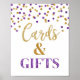 Cards and gifts wedding or baby shower sign poster in dark purple and gold confetti pattern with handwritten style lettering.
