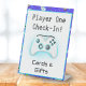 Level up your gratitude in gamer style! 🎮 This fun cards and gifts sign features a gaming controller with neon blue highlights on a background of bold pattern of gaming controllers in a vibrant world filled with a “Level Up” cake, confetti, balloons, dragons, aeroplanes, and other playful details.