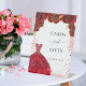 A sign for cards and gifts. A white background with red faux glitter sparkles, a red dress and red roses, florals.