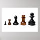 A line of five chess pawns of different sizes from the smallest to the left to the largest to the right as a symbol of business career growth. Isolated against the white background.
