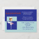 A charming and whimsical invitation featuring a caricature nurse holding an oversized hypodermic needle. The blue on blue boxed background is also trimmed with a pulse monitor graph.