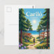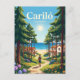 This illustration depicts the distinct ambiance of Cariló. A lone male traveller with a backpack walks on a winding dirt path that cuts through the thick, stylised pine forest. The clean-edged, flat colour fields highlight the deep, rich greens of the woodland and the warm, sunlit whites of the sand and buildings, creating strong graphic contrast and abundant negative space. The distant commercial centre's rustic architecture is visible, and the high-contrast sunlight creates crisp, graphic shadows, enhancing the calm, sophisticated atmosphere.